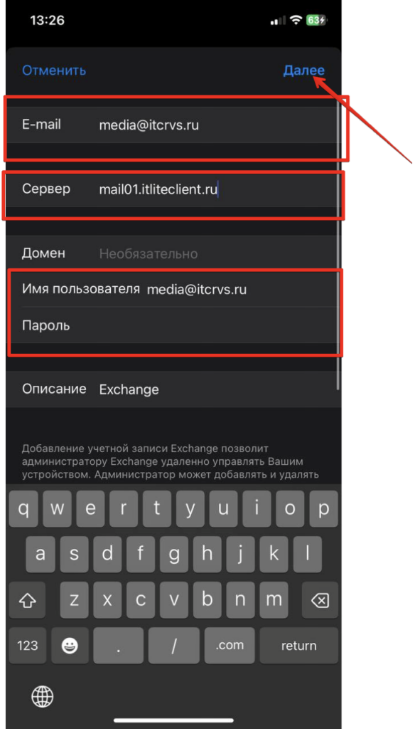 Вводим параметры сервера для подключения, логин и пароль пользователя