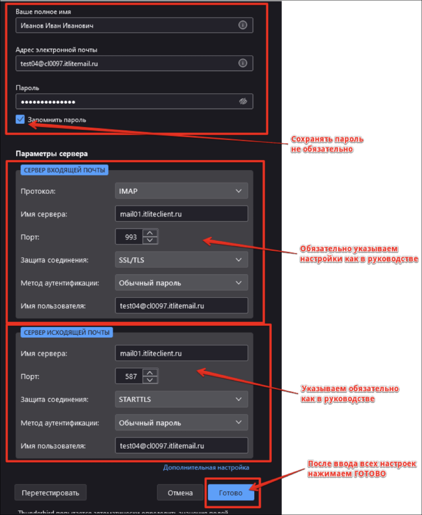 3. Вводим параметры входящей и исходящей почты как указано на скриншоте.